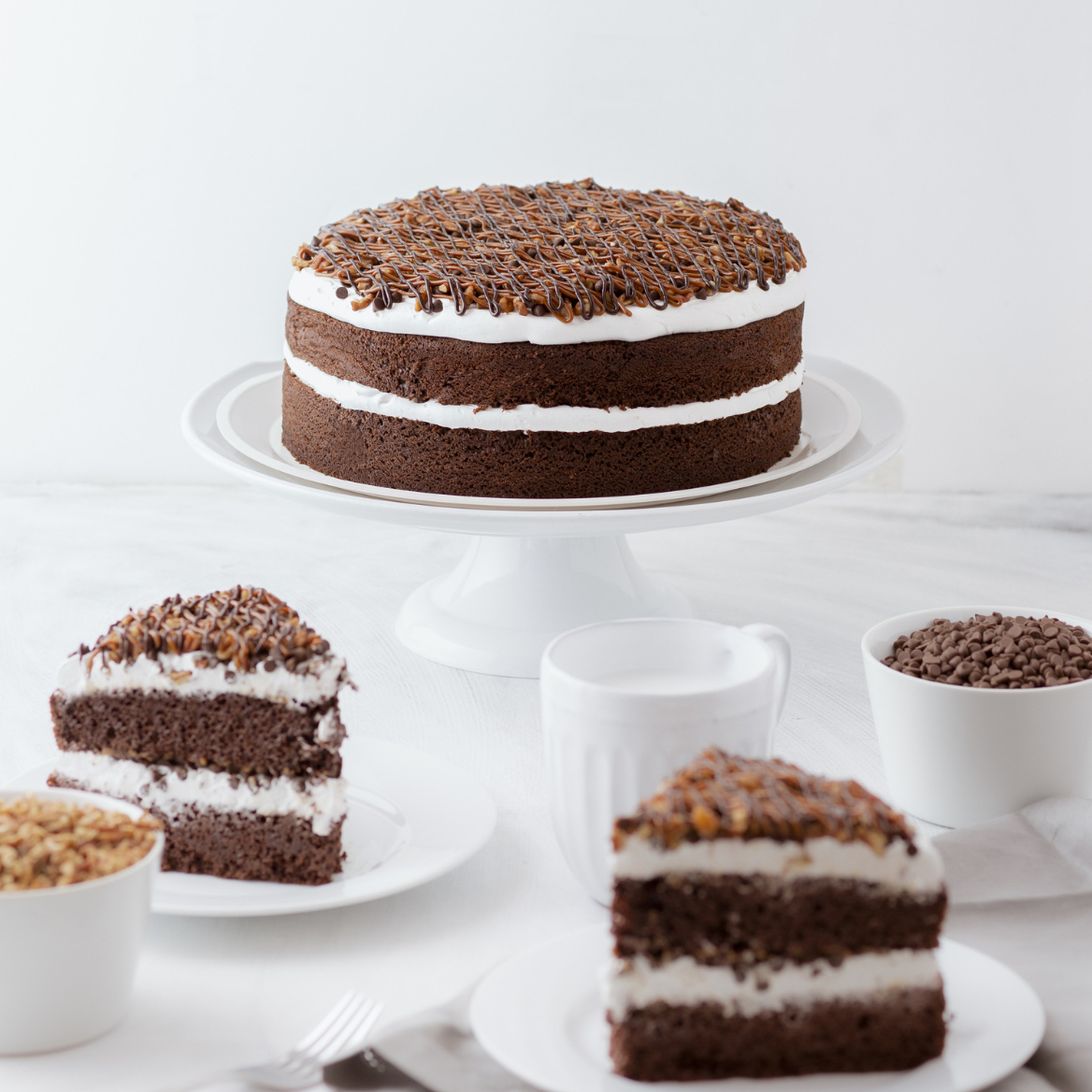 Pan de chocolate cubierto de crema chantilly, con choco-chispas, nuez, líneas de cajeta y chocolate. (12 a 15 rebanadas).