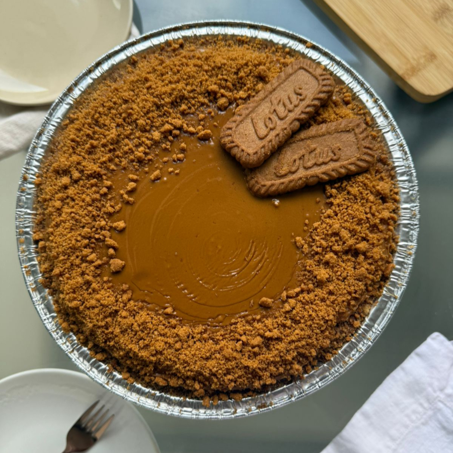 Pay de queso crema elaborado con la famosa Lotus Biscoff. Lleva una base de galleta horneada, relleno de suave queso sabor biscoff y decorado con crema y galletas de Lotus Biscoff. Puede rendir 12 rebanadas
