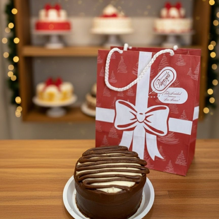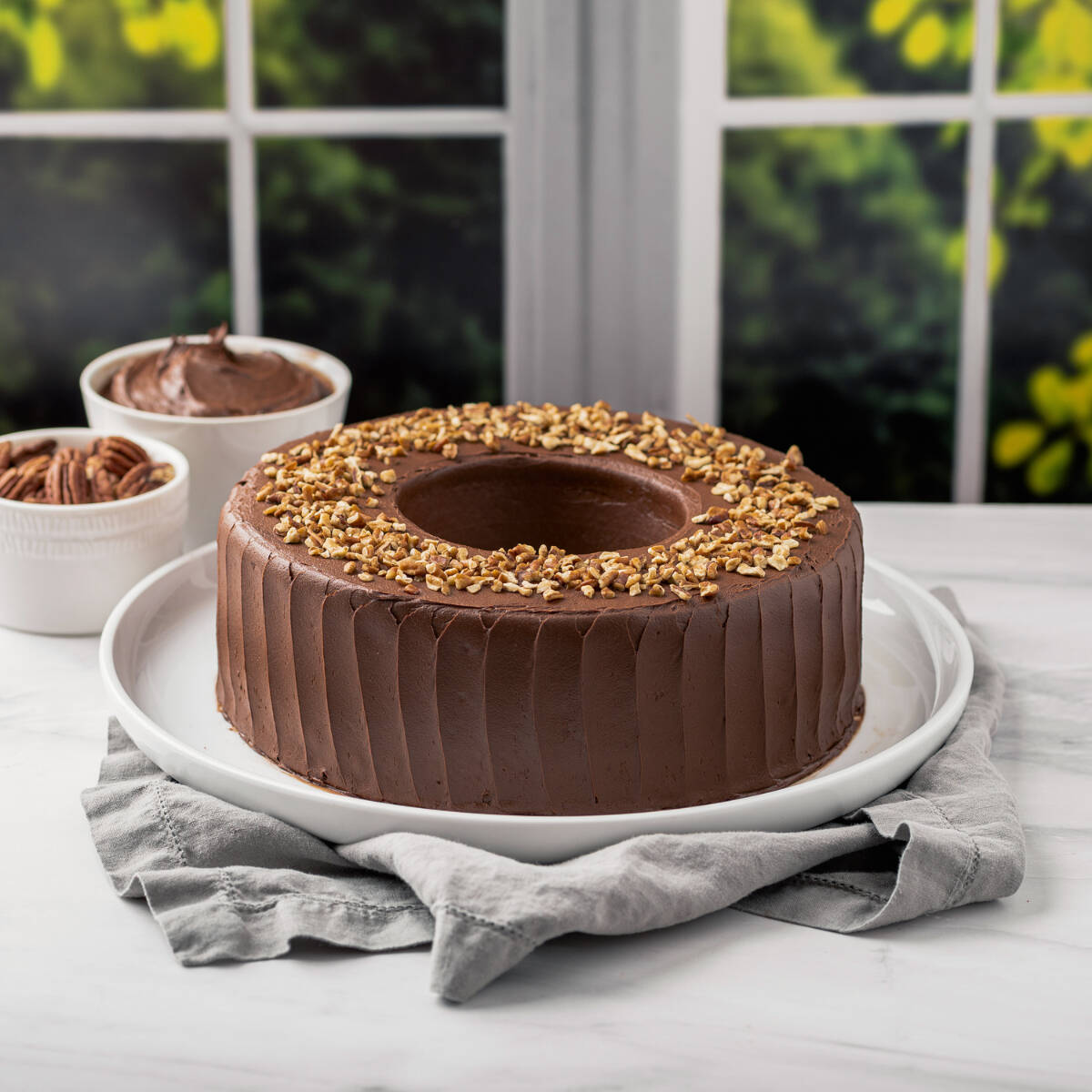 Exquisita rosca de pan sabor vainilla, cubierta con betún de chocolate y decorada con trocitos de nuez. GRANDE (Rinde de 15 a 18 rebanadas)