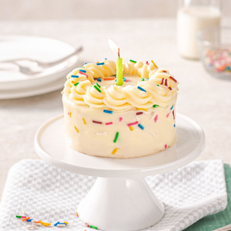 Divertido pastelito de vainilla, cubierto de betún de mantequilla y queso crema, con chispas de colores por dentro y por fuera