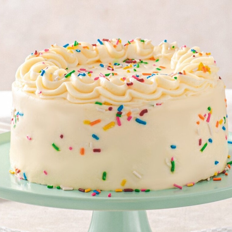 Divertido pastel de vainilla, cubierto de betún de mantequilla y queso crema, relleno de cajeta, con chispas de colores por dentro y por fuera... ¡especial para tus festejos! puede rendir de 8 a 10 rebanadas.