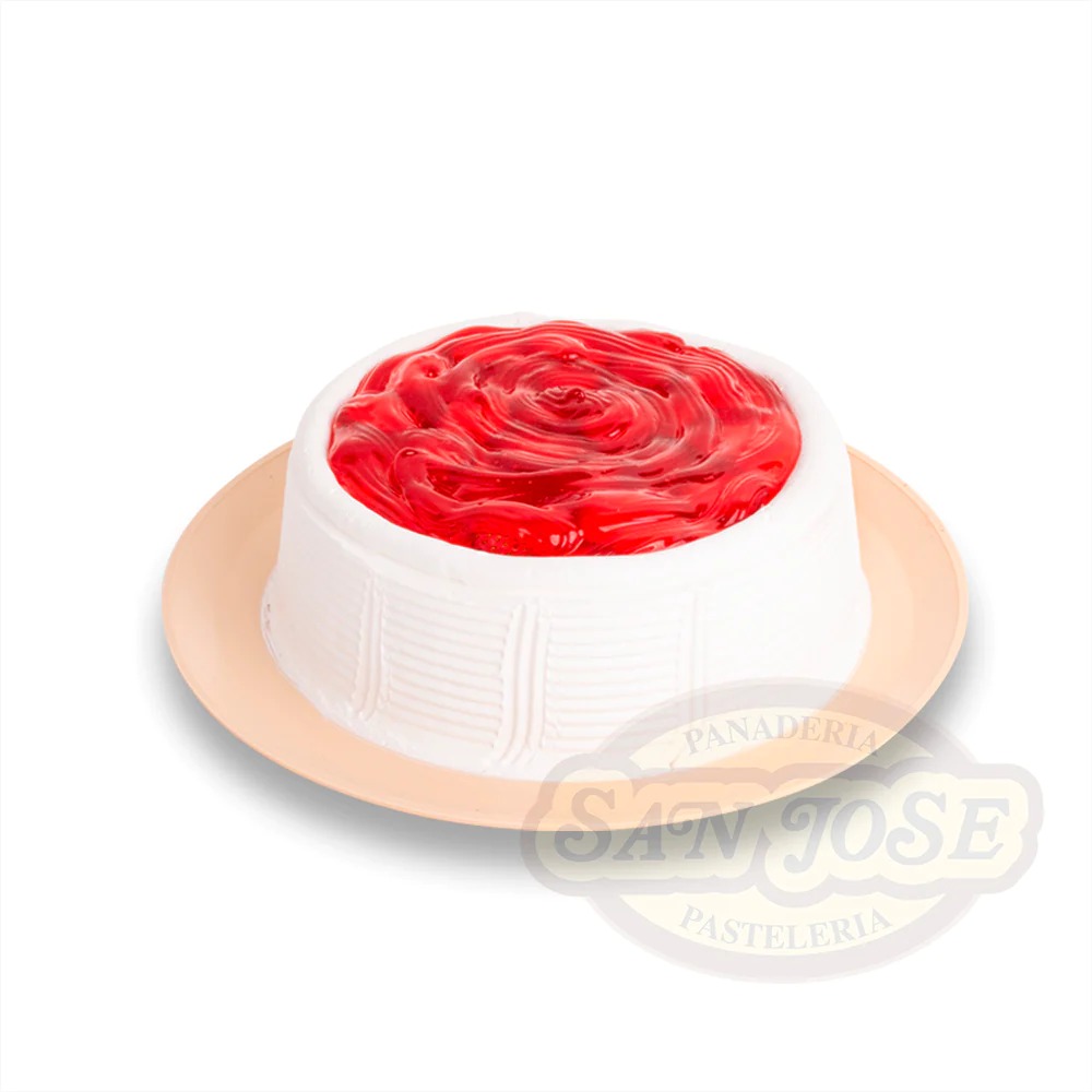 Pastel de pan de vainilla mojado en 3 leches relleno de crema pastelera de vainilla, cubierta de crema de vainilla, fresa, piña y glace, disponible para 20 personas.