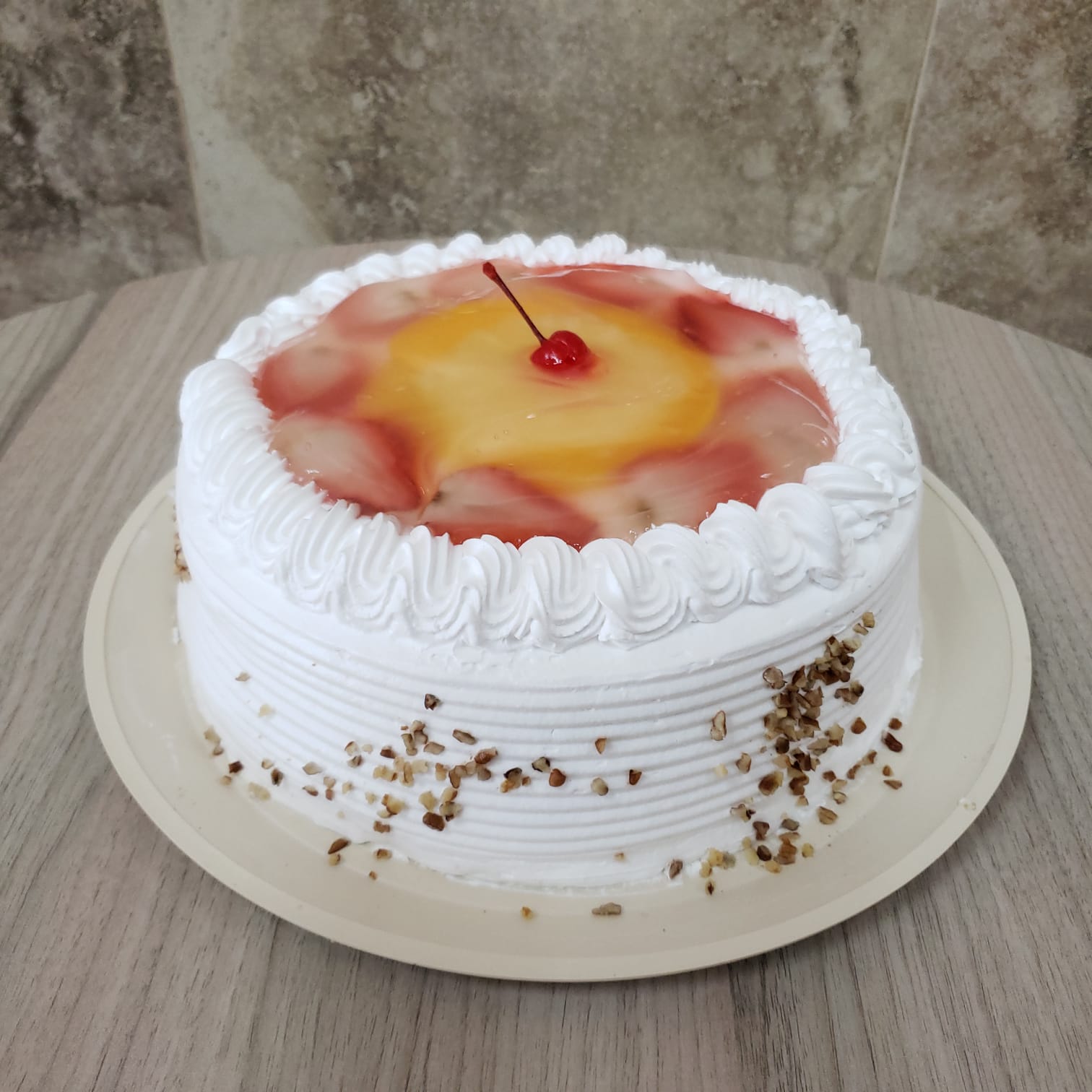 Pan: Vainilla Mojado en 3 Leches Relleno: Una Capa de Queso Cubierta: Crema de Vainilla, Decorado con Piña, Durazno, Fresa, Cereza, Nuez y Glace Disponible en: 20 Personas