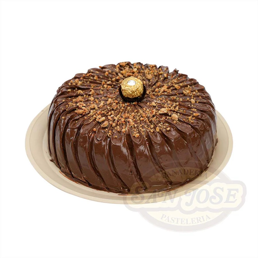 Delicioso pan chocolate relleno de crema de chocolate, avellanas y nutella. Cubierto de crema láctea y decorado con chocolate Blanco, Avellanas y 3 Chocolates Ferreros Para 20 Personas