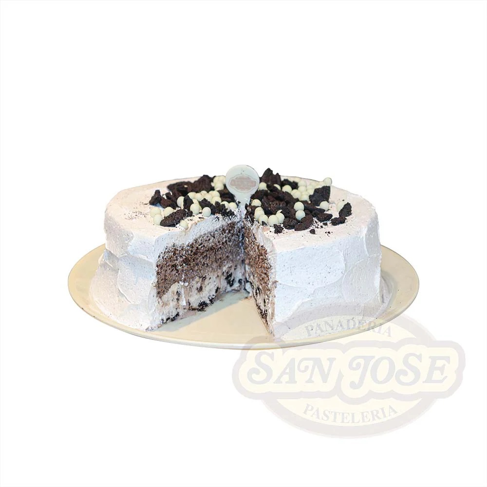 Pan: cheesecake con galleta Oreo, relleno: sin relleno, cubierta: crema de vainilla con galleta, decorado: galleta Oreo entera y galleta molida, disponible en: 20 personas.