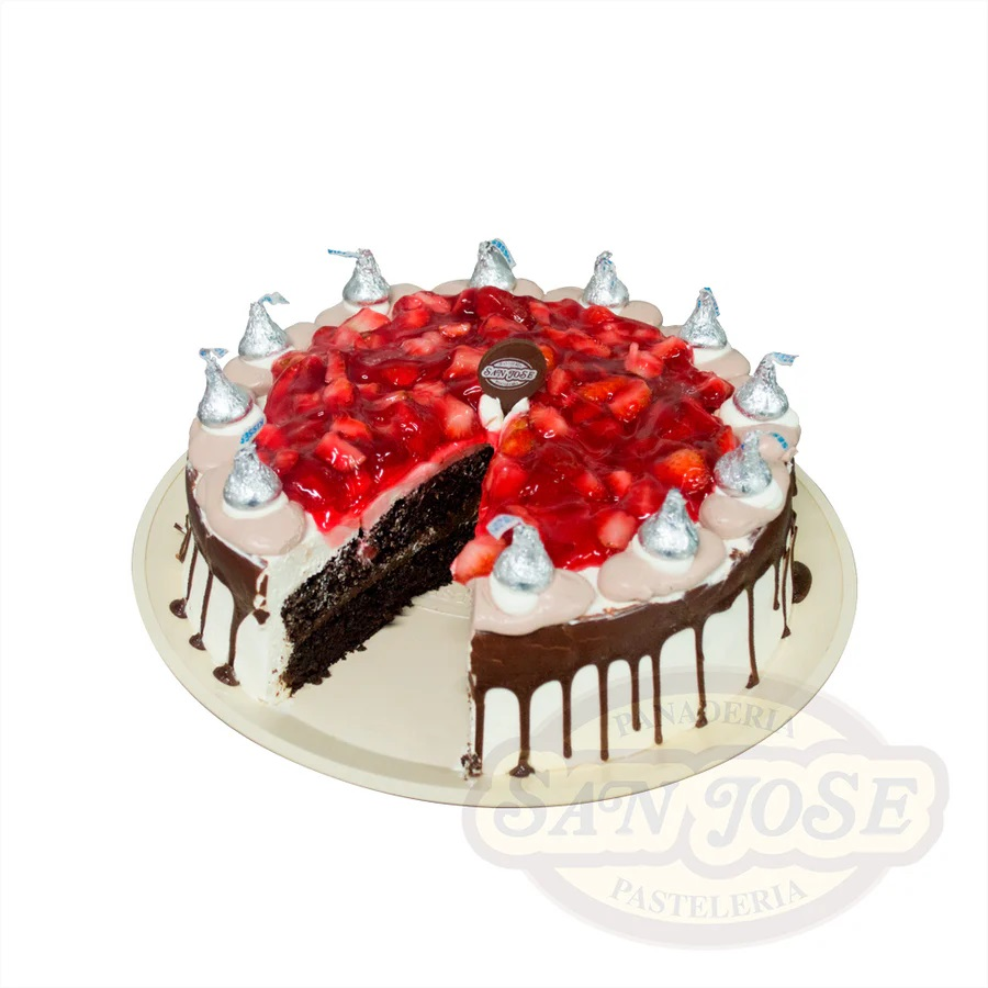 Pan: Chocolate húmedo con Jarabe de Cereza Relleno: Crema de Chocolate, Mermelada de Fresa Cubierta: Crema de Chocolate, Decorado con Ganash, Fresas, Rollitos de Chocolate Blanco y Cerezas Disponible en: 20 Personas