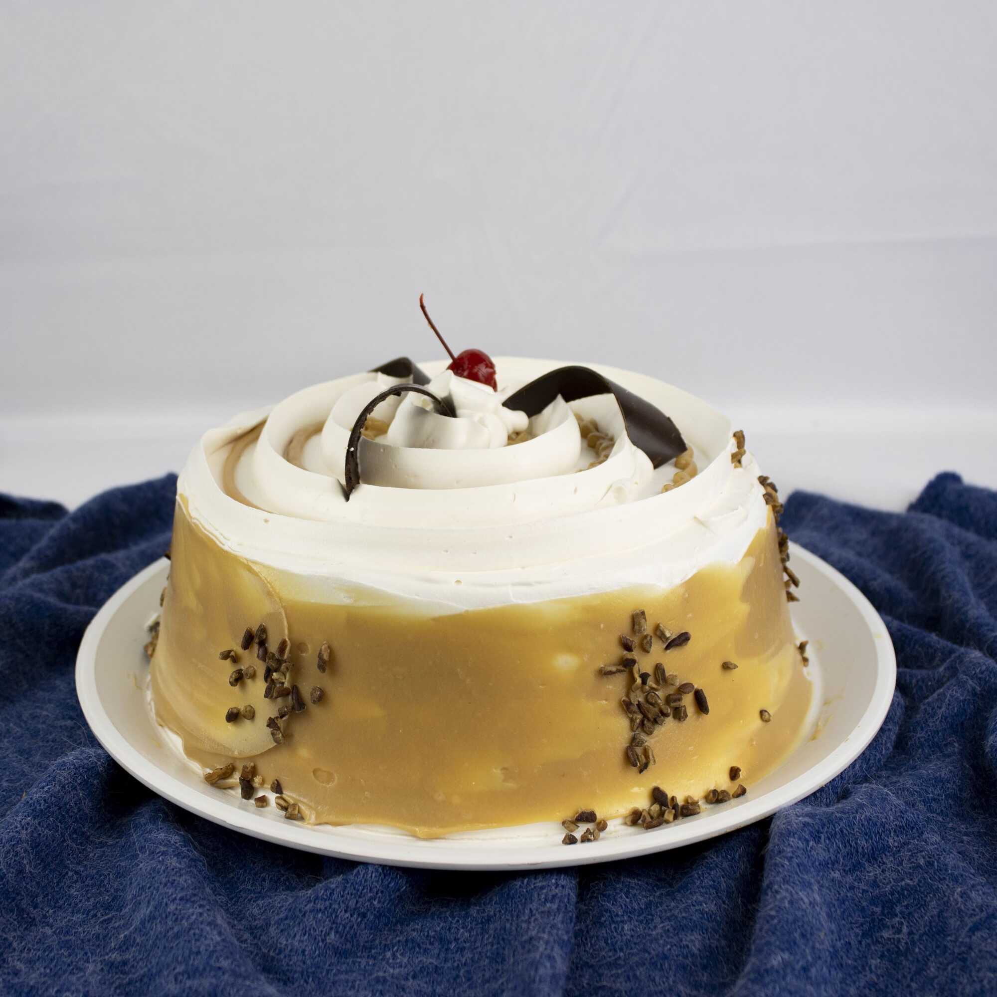 Pan vainilla mojado en 3 leches, relleno de chantilly con cajeta y nuez, cubierto, cubierto con chantilly con cajeta, nuez y rizos de chocolate