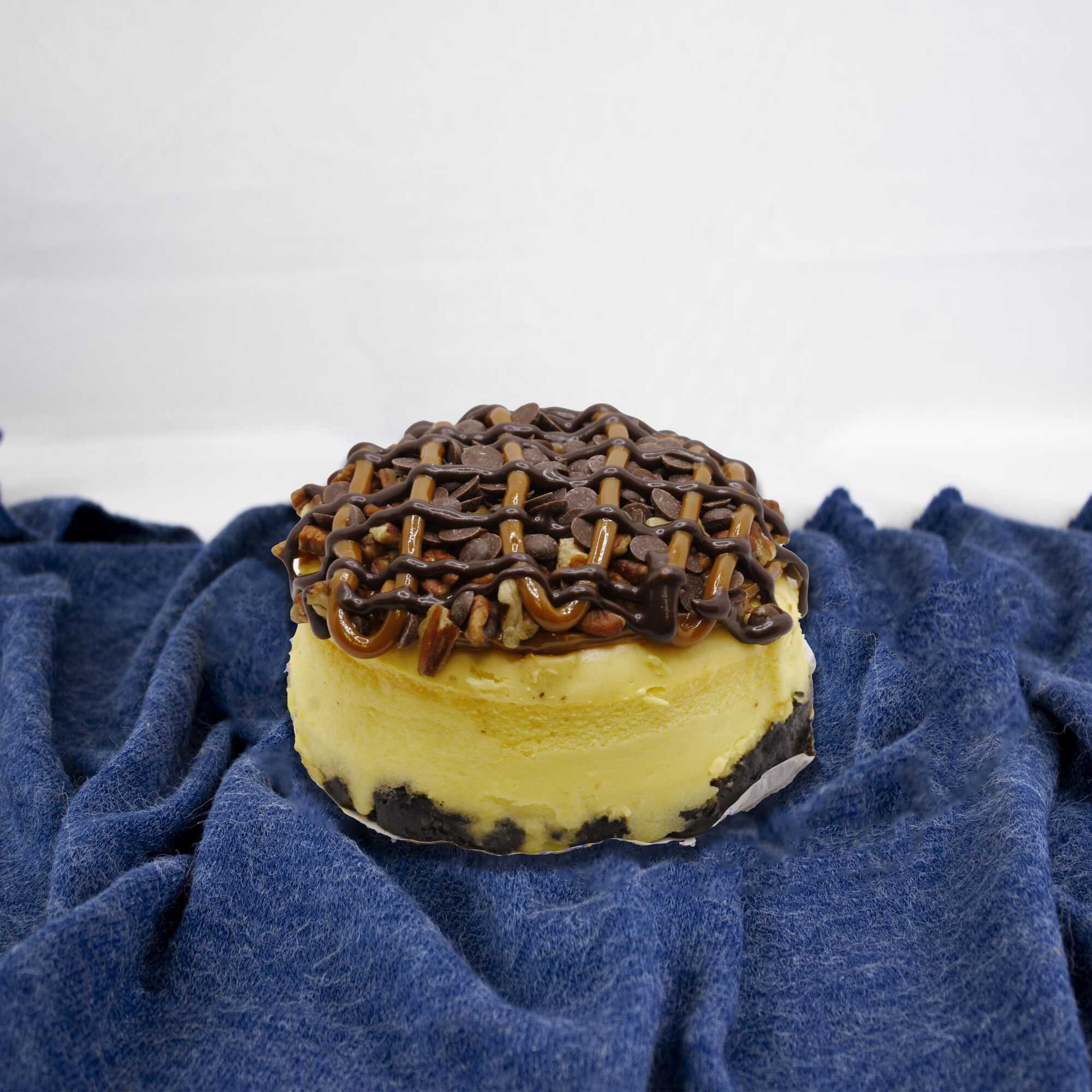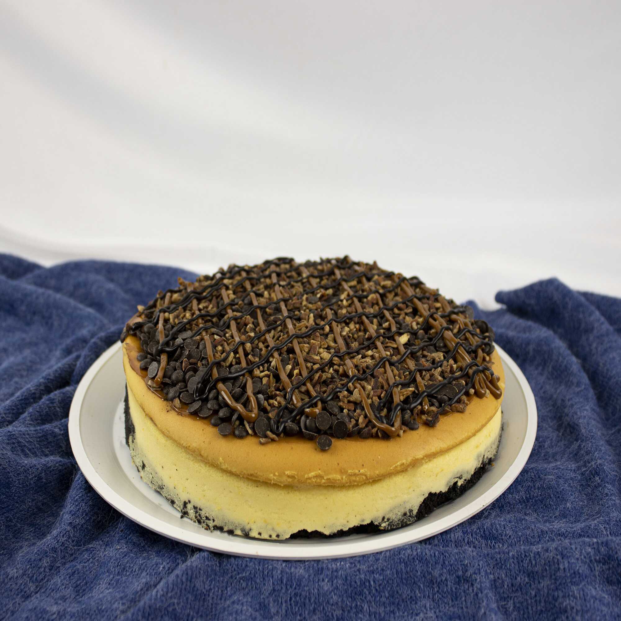 Queso horneado cubierto con cajeta, nuez, chispas de chocolate y ganache oscuro. (no se agregan desechables o cubiertos)