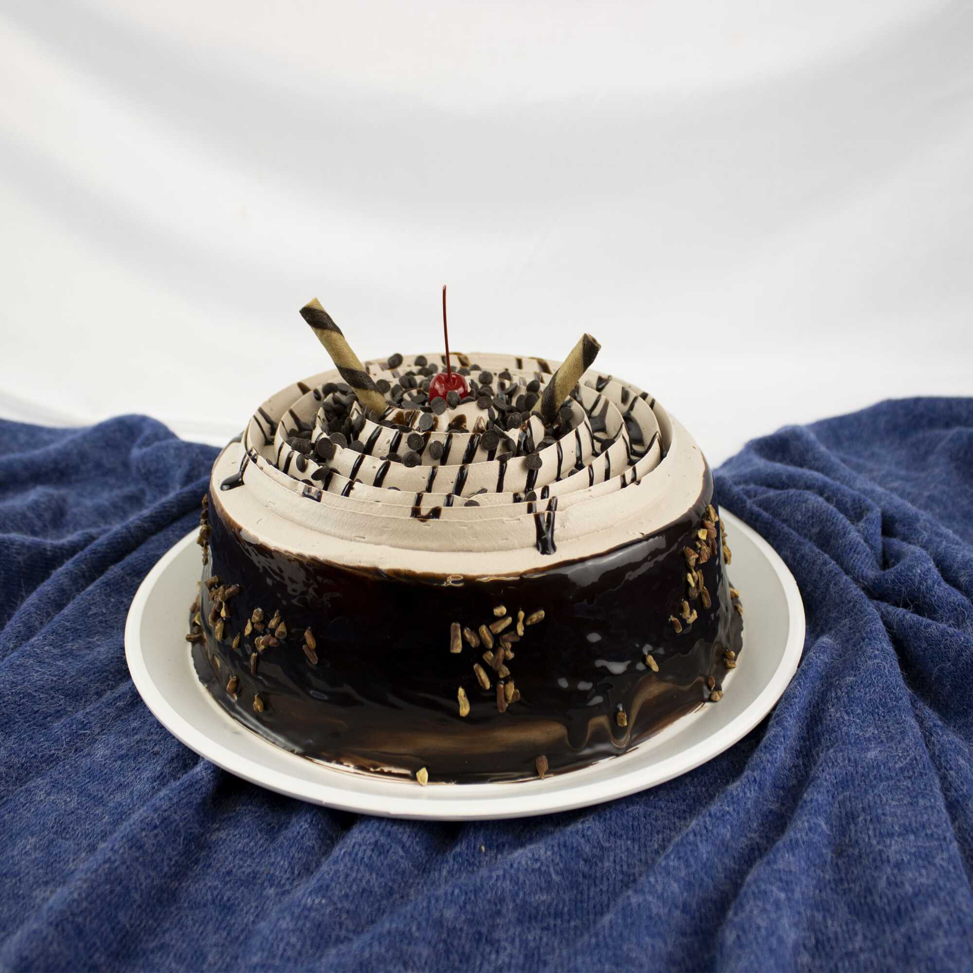 Pan de chocolate, pay de queso y flan de vainilla, cubierto con chantilly con cajeta, chocolate y nuez.(No se agregan desechables o cubiertos).