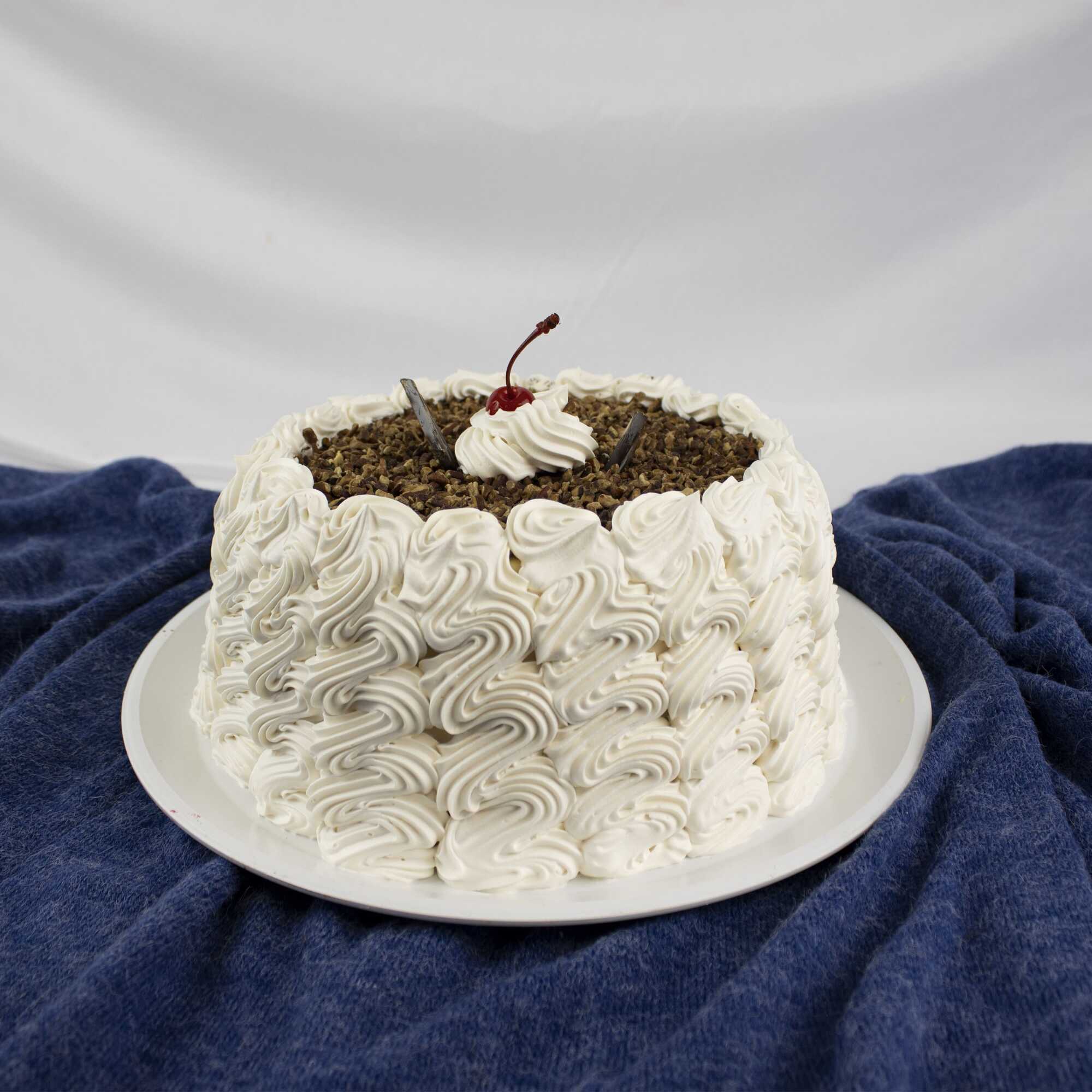Pan vainilla mojado en 3 leches, relleno de chantilly con cajeta y nuez, cubierto con chantilly con cajeta, nuez y rizos de chocolate.