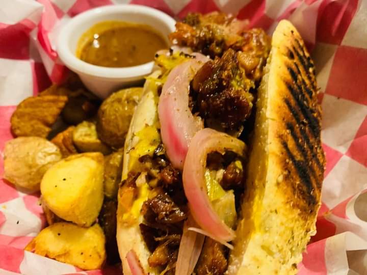 Una delicia, nuestra torta de carnitas y crujiente chicharron de cachete elaborado en casa, incluye su salsa tlaquepaque, cebolla morada, chucrut y papas de galeana fritas.