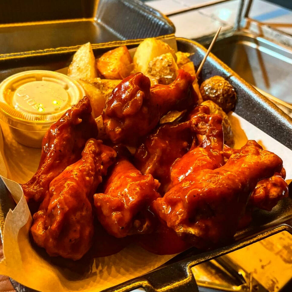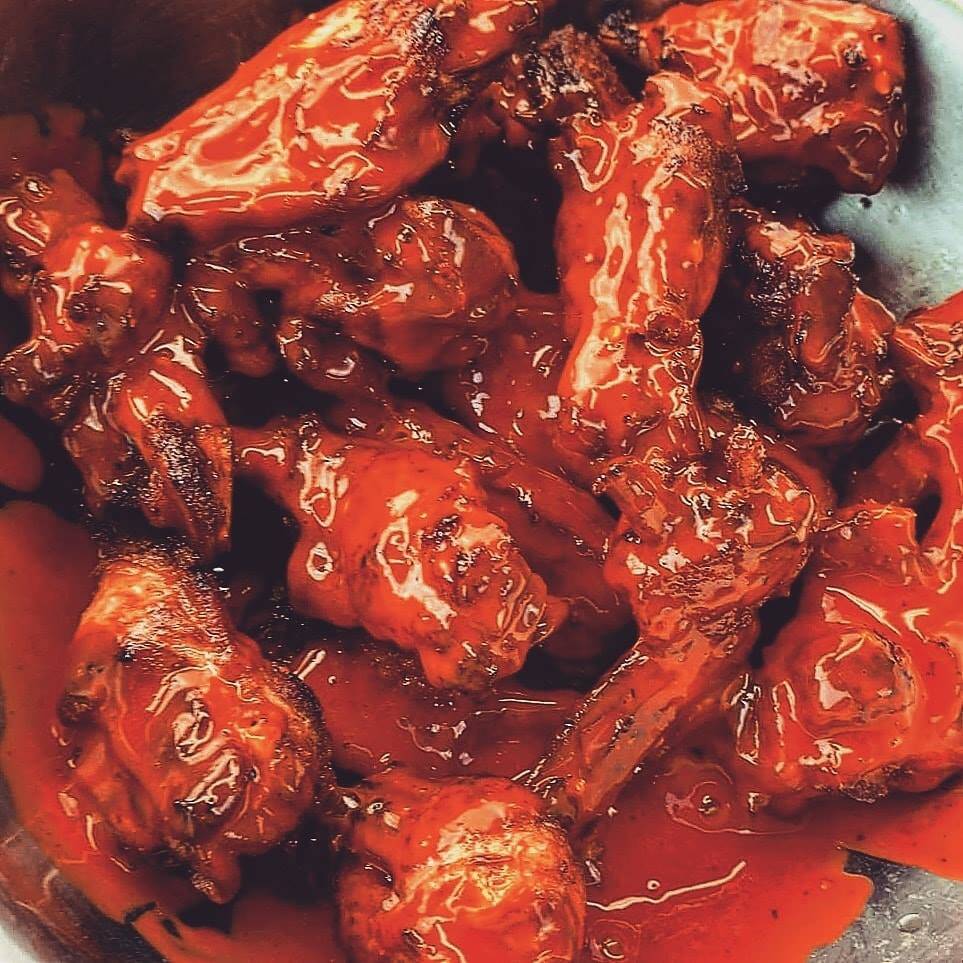 8 Alitas de pollo bañadas en su salsa preferida, acompañadas con papas fritas de galeana y aderezo ranch.