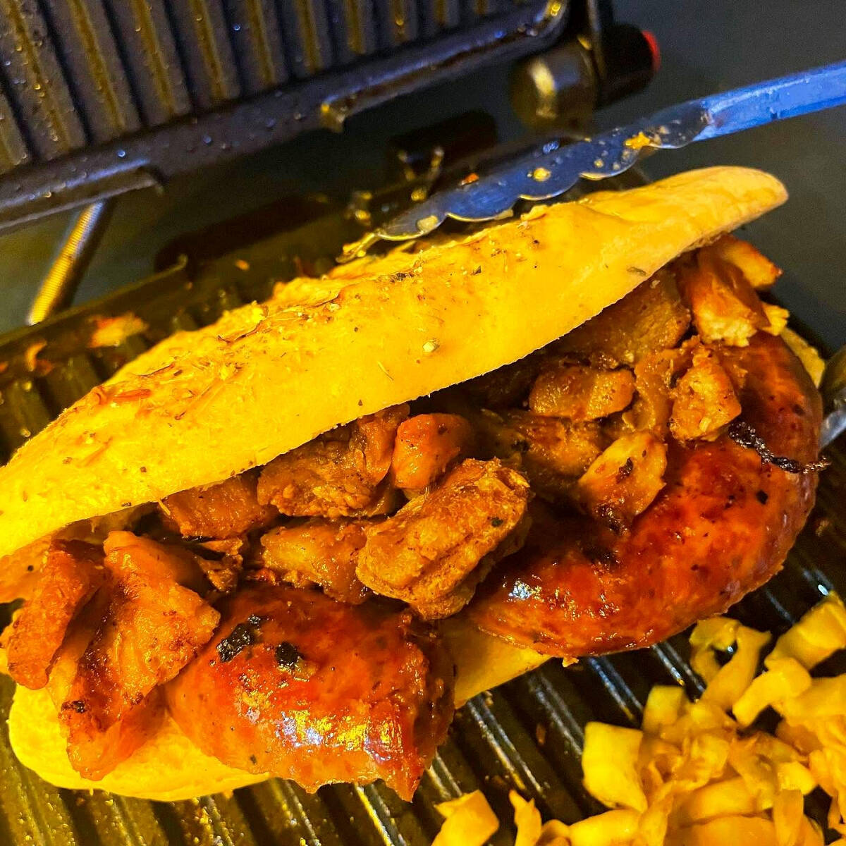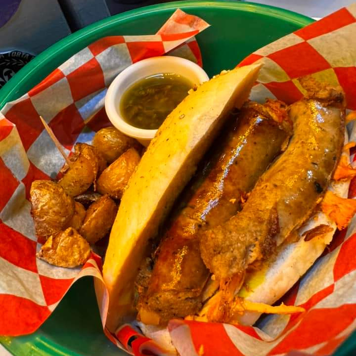 Nuestra clasica torta de Chorizo Argentino, el de los estadios. Acompañada de un poco de chucrut, cebolla morada, salsa habanero y chimichurri. Incluye papas de galeana fritas.