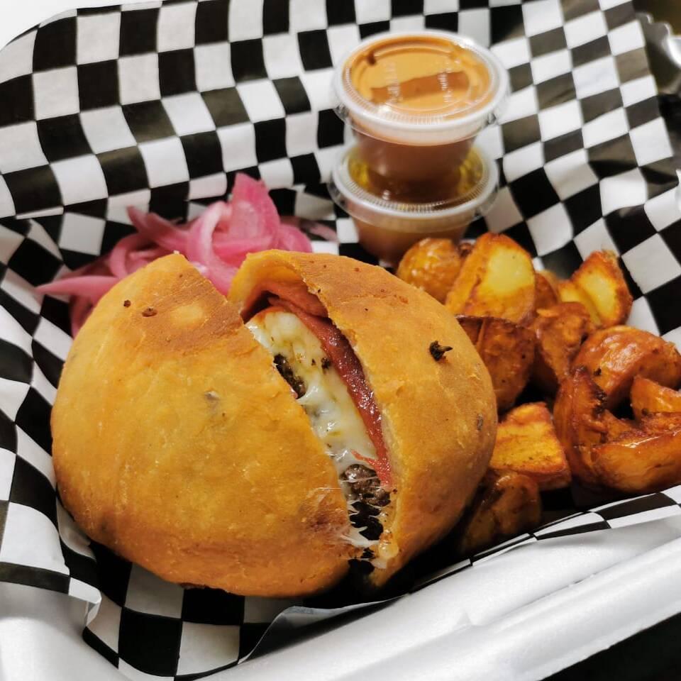 Hamburguesa de res frita, rellena de pepperoni, queso manchego gratinado y champiñones, todo esto envuelto en una ligera pero crujiente masa de pizza. Acompañada de papas de galeana fritas