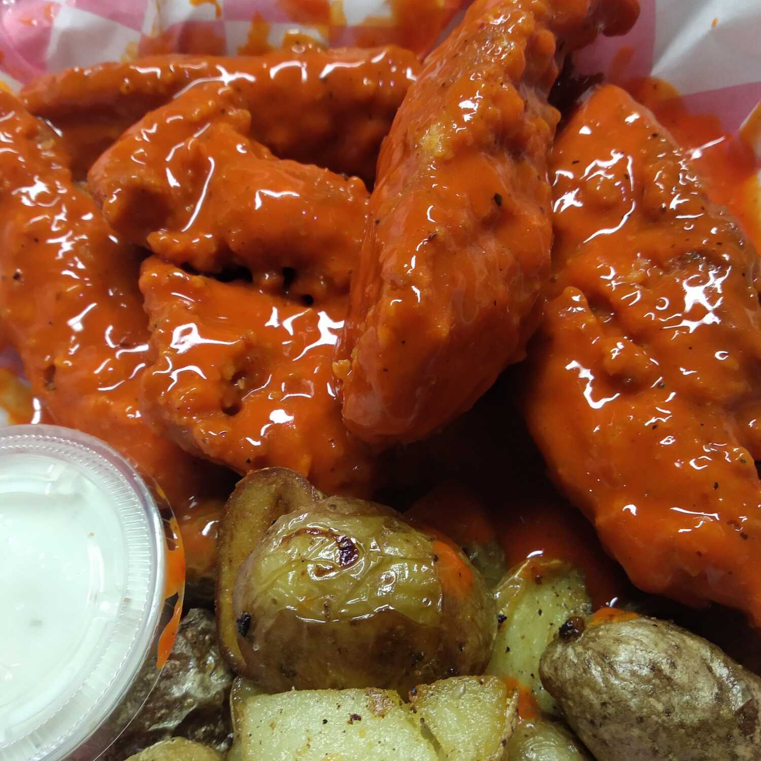 20 piezas de Alitas de pollo bañadas en tu salsa preferida, acompañada de papas de galeana y aderezo ranch.