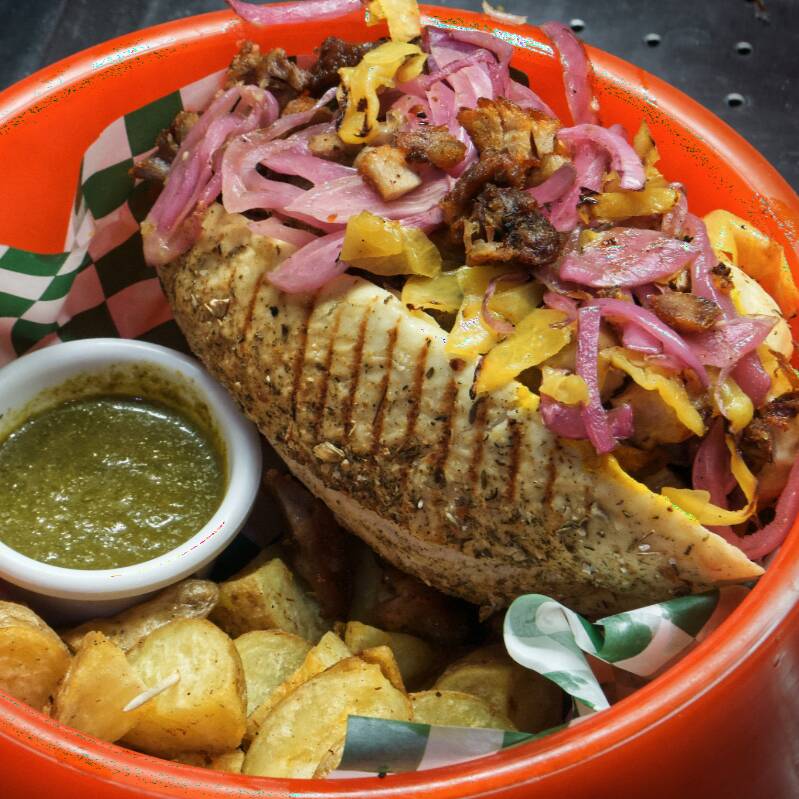 Una mezcla de dos cielos, chorizo argentino, con crujiente chicharron estilo la ramos, carnitas de puerco y cebolla morada. Se acompaña con papas galeana fritas y su chimichurri.
