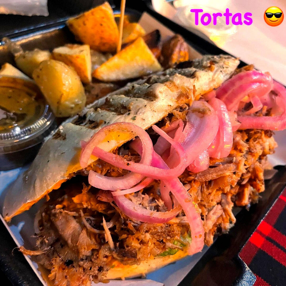 Nuestra deliciosa torta de cochinita pibil, con su respectivo sabor Yucateco, acompañada de cebolla morada con habanero, salsa tlaquepaque y sus papas de galeana fritas