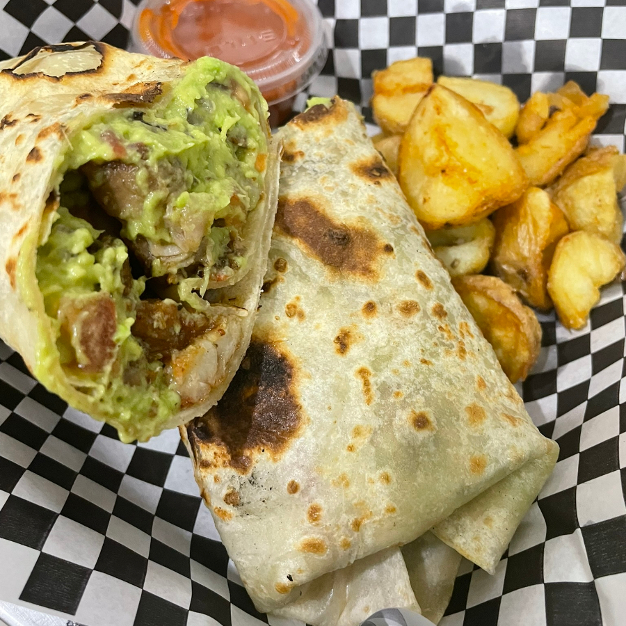 Burrote de 35 cm, tenders fritos de pollo, guacamole, cebollita curtida, zanahoria y lechuga, acompañado de papas de galeana fritas y su salsa original buffalo.