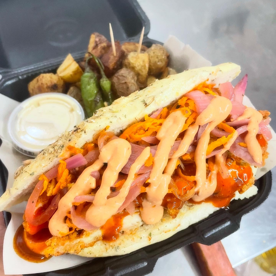 Una estrella, nuestra torta de chicken tenders, incluye zanahoria, cebolla morada, aderezo chipotle y su salsa buffalo para bañarla. Se acompaña de papas fritas galeana.
