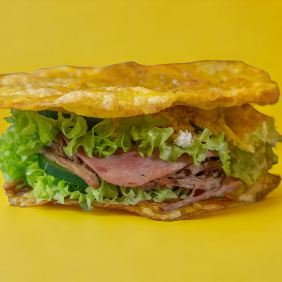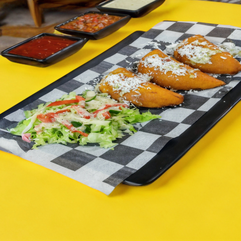 Crujiente platano verde pisado, relleno de carne mechada o pollo en nuestra salsa poblana con lechuga, tomate y pepino. Decorado de queso fresco con tocino ahumado y aderezo de la casa