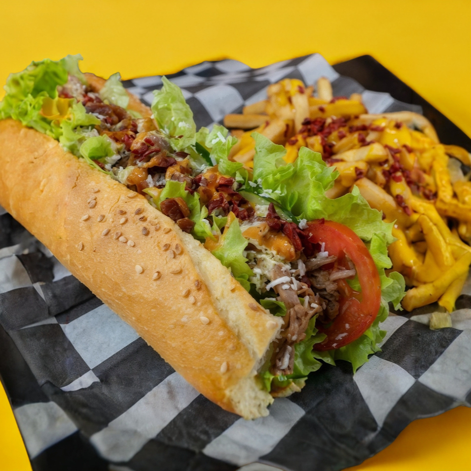 Delicioso pan baguette con carne mechada en su jugo, con lechuga, tomare y cebolla. Decorado con queso fresco y aderezo de la casa (Acompañado de papas a la francesa bañadas en queso cheddar y trozos de tocino ahumado)
