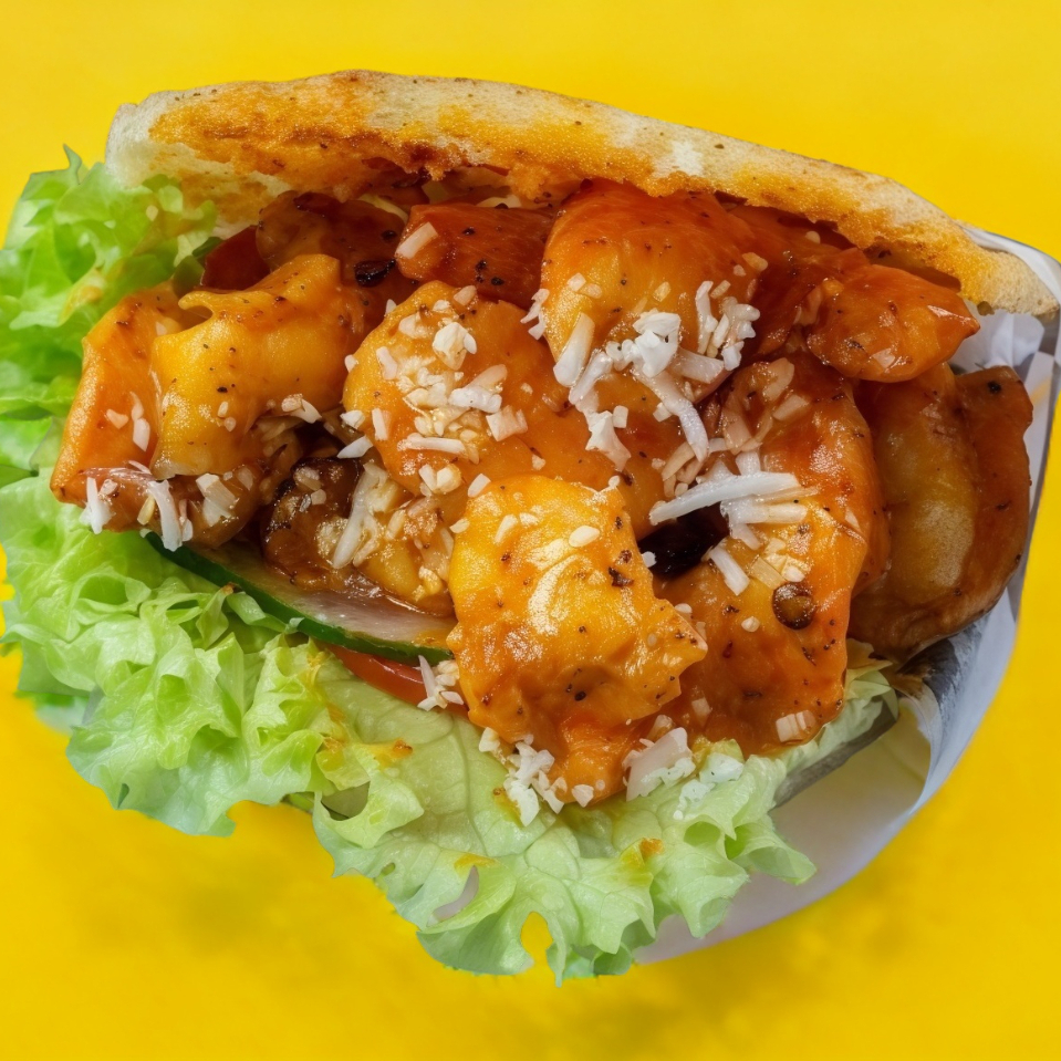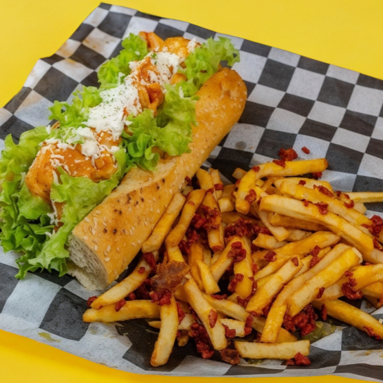 Delicioso pan baguette con camarones en nuestra salsa chipotle, empanizados o al mojo de aj con lechuga, tomate, y pepino. Decorado con queso fresco y aderezo de la casa (Acompañado de papas ala francesa bañadas en queso cheddar y tocino ahumado)
