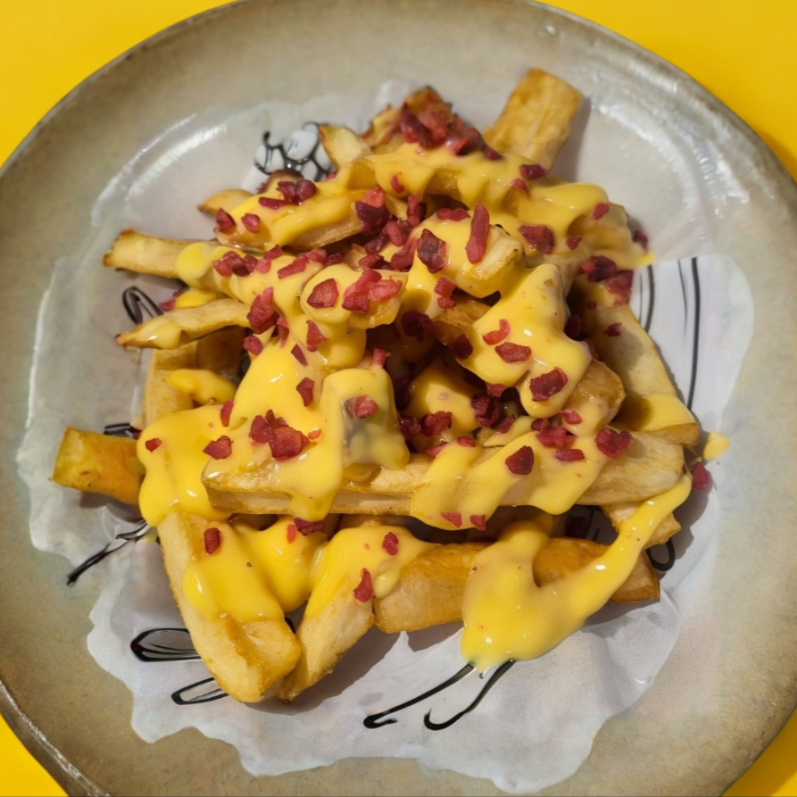 Deliciosas papas ala francesa bañadas en queso cheddar y tocino ahumado