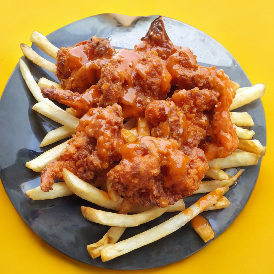 Increibles trozos de pollo crujiente, bañados en salsa de su elección con papas a la francesa, queso cheddar y tocino