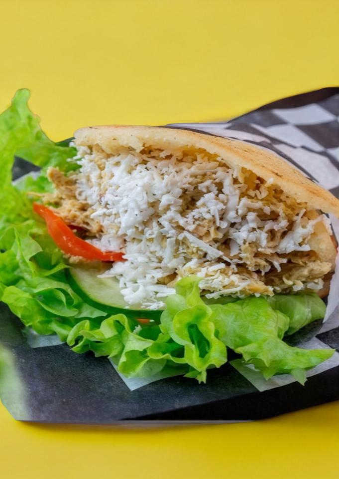 Exquisita arepa venezolana hecha de harina de maiz precocido rellena de pollo en nuestra salsa poblana con lechuga, tomate y pepino. Decorado con queso fresco y aderezo de la casa