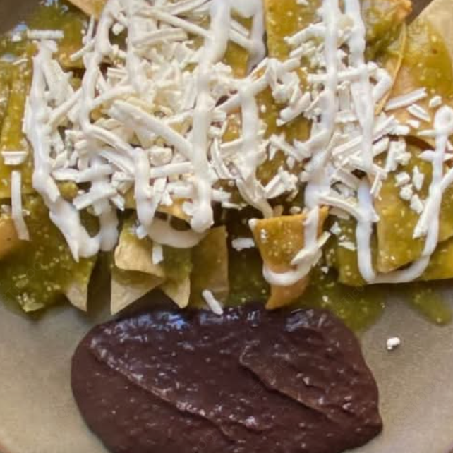 Totopos de maíz bañados en salsa verde de tomatillo, con crema y queso fresco, acompañados con frijoles negros.
