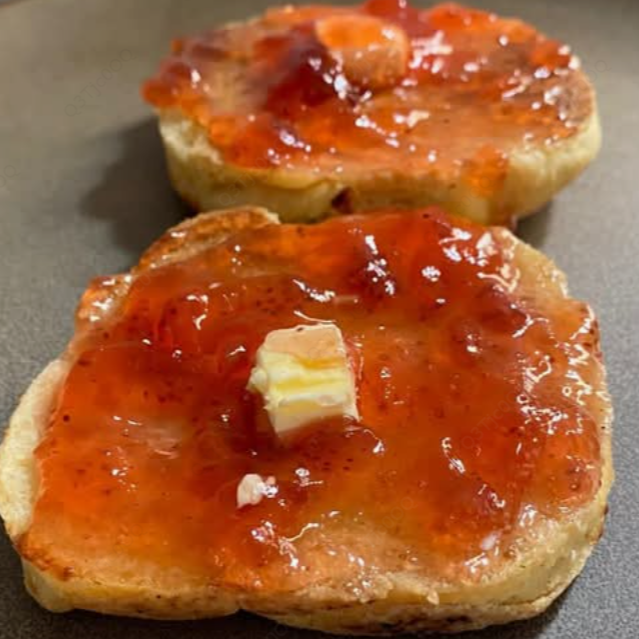 1 Bisquet partido a la mitad doradito, se envía con mantequilla y mermelada de fresa.