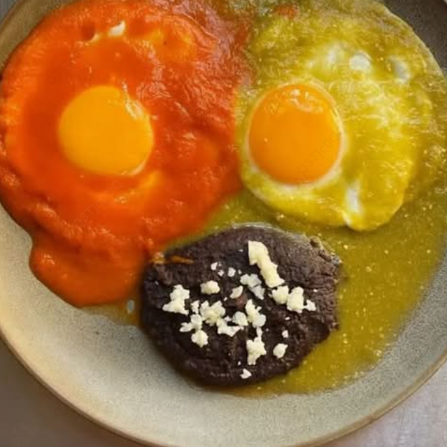 Huevos estrellados sobre tortillas de maíz recién hechas, bañados en salsa roja y verde, con frijoles quesito y totopos.