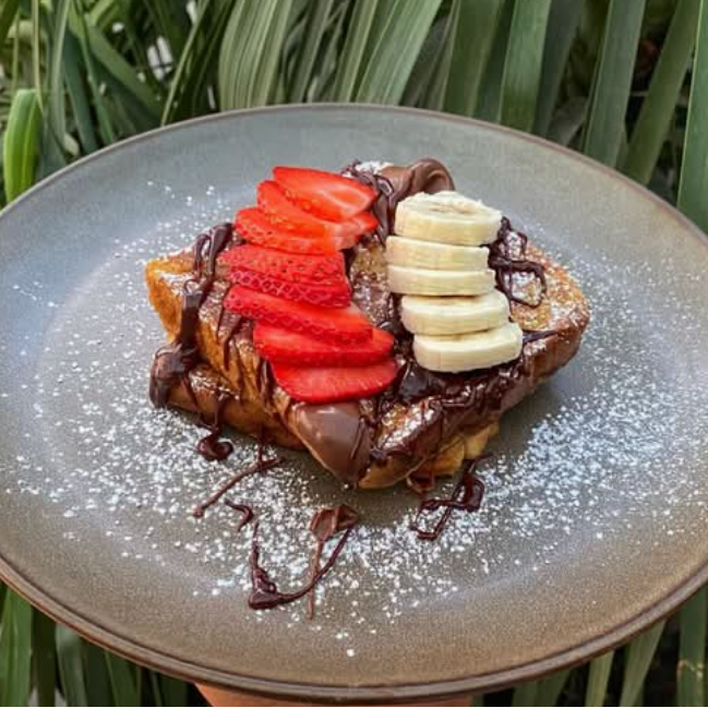 2 pzas De pan de barra con nuestra mezcla especial, doraditas, servidas con Nutella, fresas y plátano.