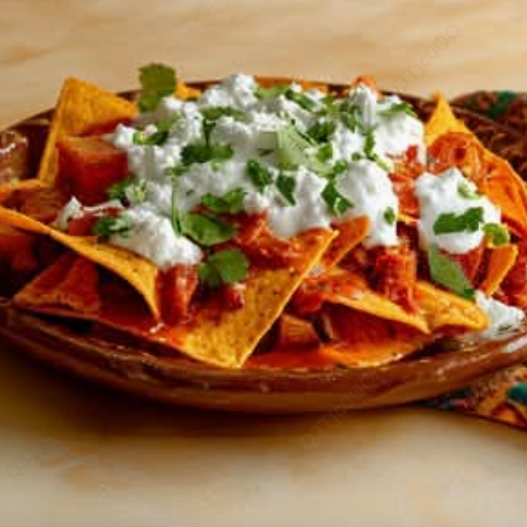 Totopos de maíz bañados en salsa roja, con crema y queso fresco, acompañados de frijoles negros.