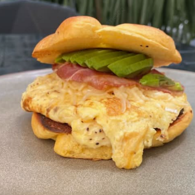 Pan de cuernito, con frijoles, huevo, queso gratinado, tocino dorado y aguacate.
