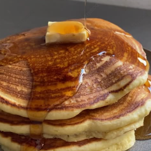 3 Esponjosos y ricos hotcakes con mantequilla y miel.
