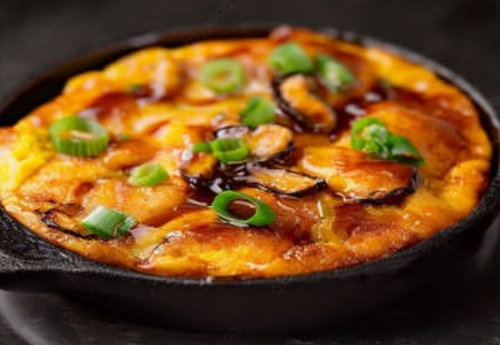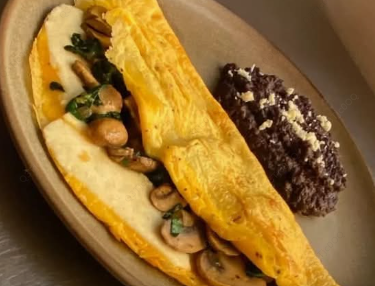 Omelette de huevito, con guiso de champiñones y espinacas, queso gratinado, acompañado de frijoles.