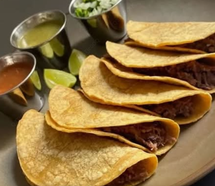 Barbacoa en tortilla de harina o maiz, acompañados de cebolla, cilantro y salsas.