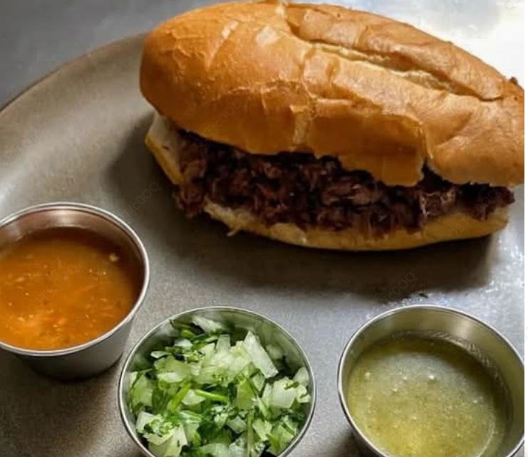 Pan frances relleno de riquísima barbacoa, acompañada con cebolla, cilantro y salsas.
