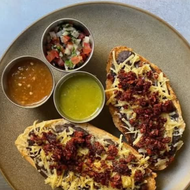 Pan bolillo con frijoles, queso gratinado, chorizo doradito y pico de gallo.