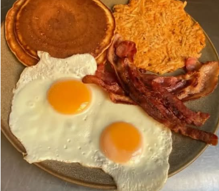 2 Esponjosos hotcakes, 2 huevos estrellados, papa hash brown y tiras de tocino doradito.