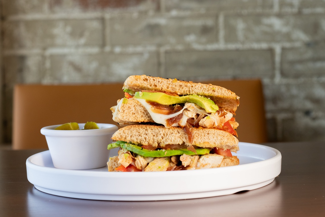 Pechuga de pollo horneada, mozzarella, aguacate, jitomate y cebolla caramelizada.