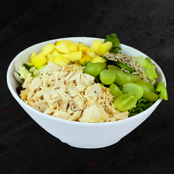 Pechuga de pollo horneada, manzana, semillas de girasol, curry, uvas y aderezo de yogur.