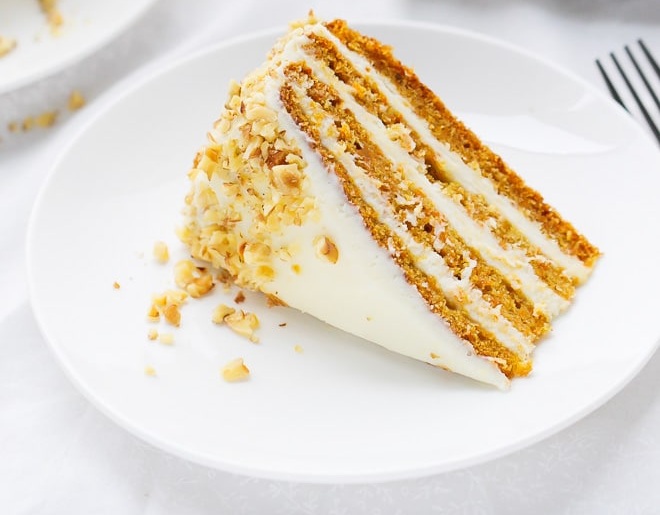 Pan sabor a canela elaborado con zanahoria y nuez, betún de mantequilla y queso crema y topping de almendra y especias.