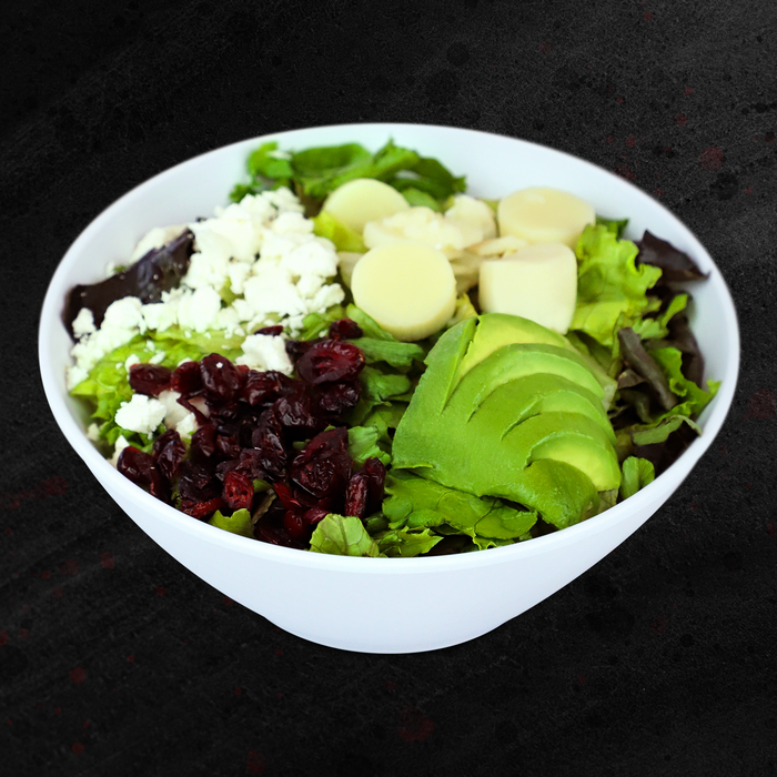 Palmitos, arándanos, queso de cabra, aguacate y aderezo de champagne.