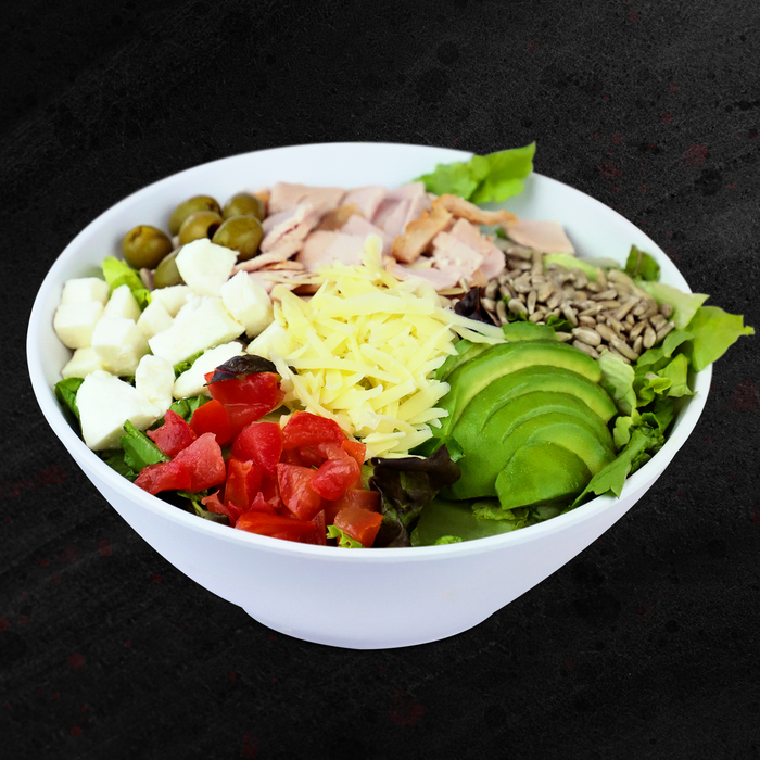 Lomo Canadiense, mozzarella, aceitunas verdes, jitomate, aguacate, semillas de girasol, parmesano y aderezo de yogur.