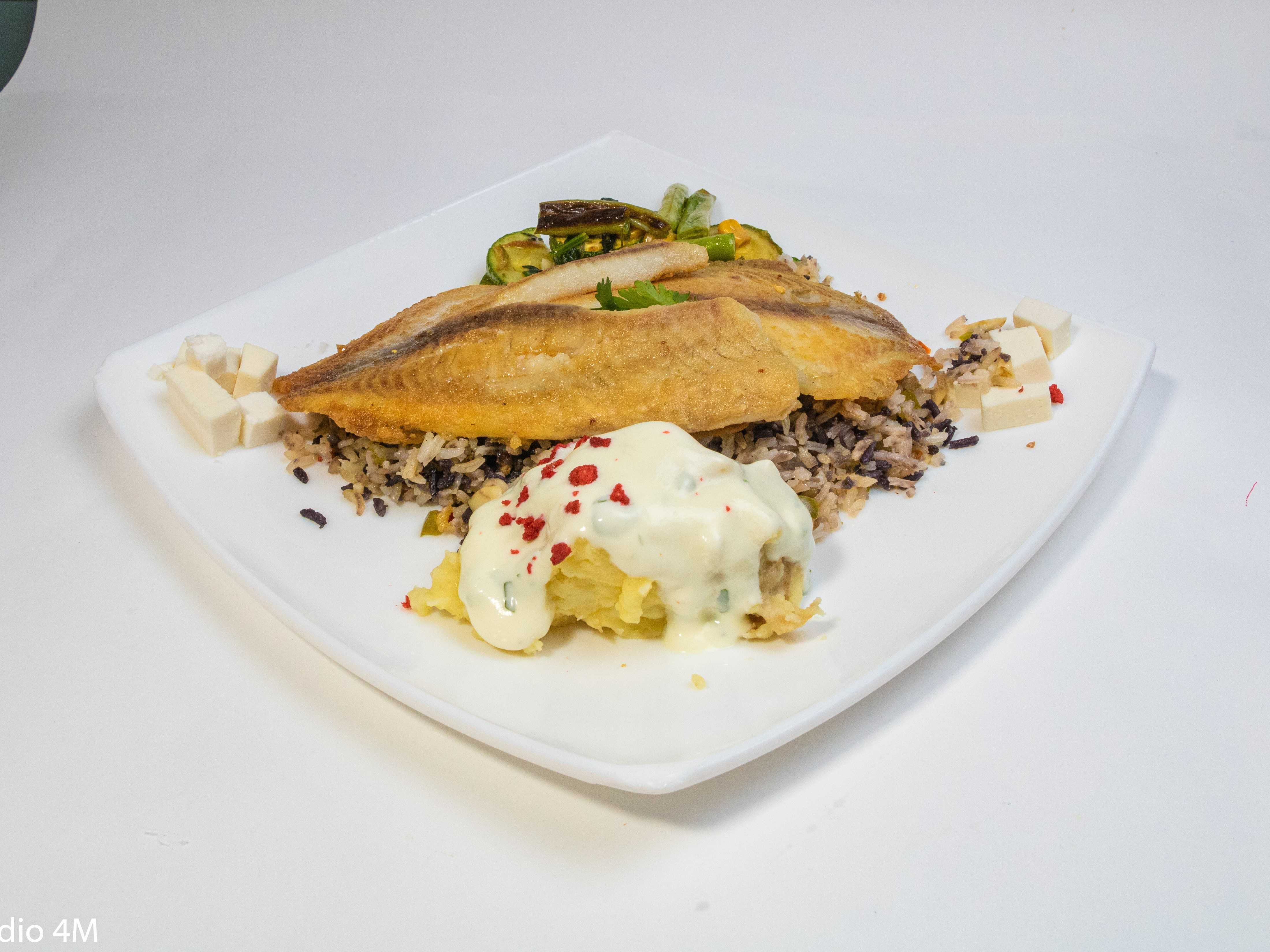 Bañado en salsa de 5 chiles, lleva espagueti marinero verde, puré de papa y verduras.