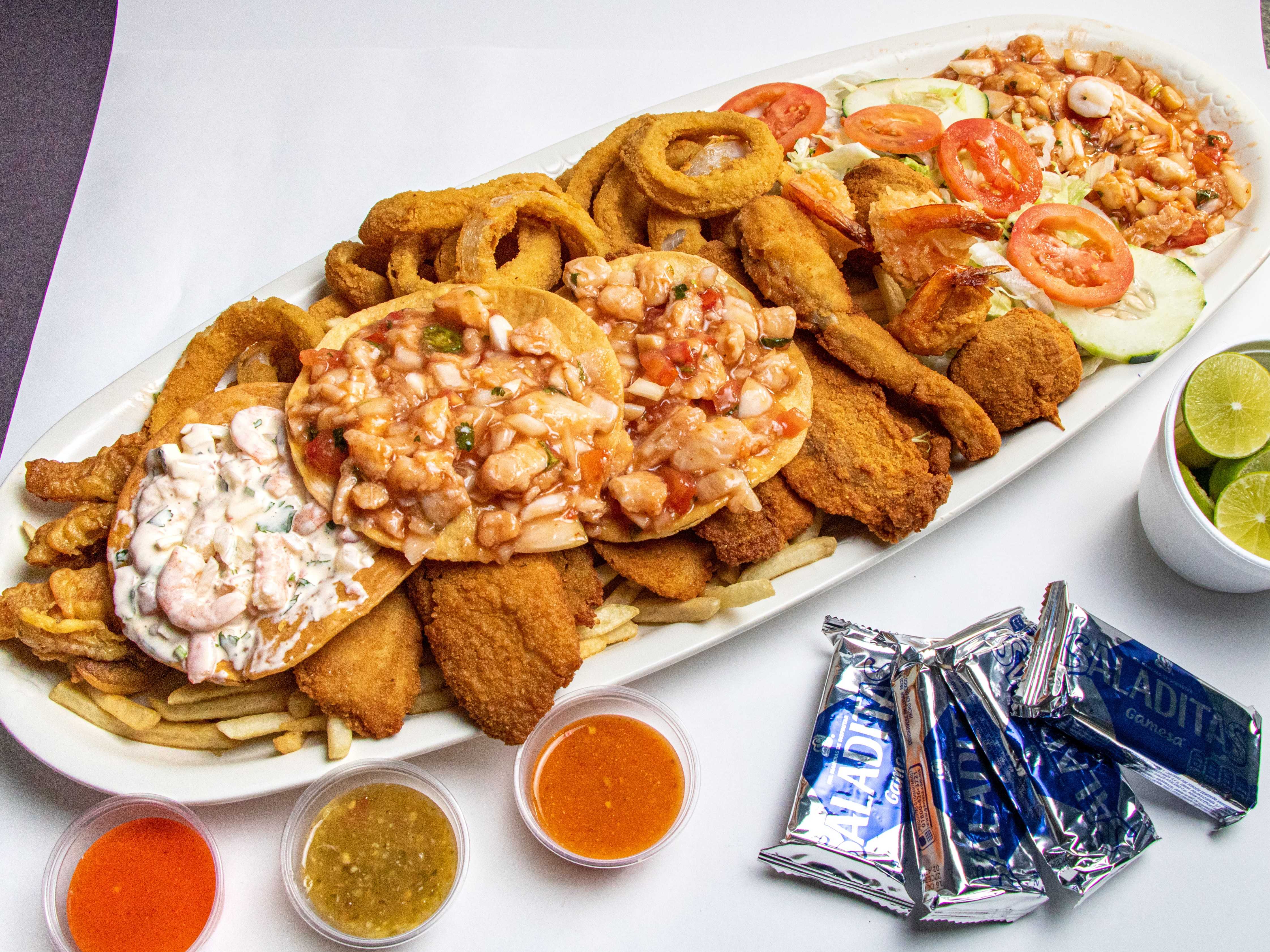 Super mariscada para 3 personas filete empanizado, rollo de filete, 2 camarón al coco, ceviche mixto, aros de cebolla, chicharrón de pescado, tos de ceviche e incluye 1 litro de caldo de entrada