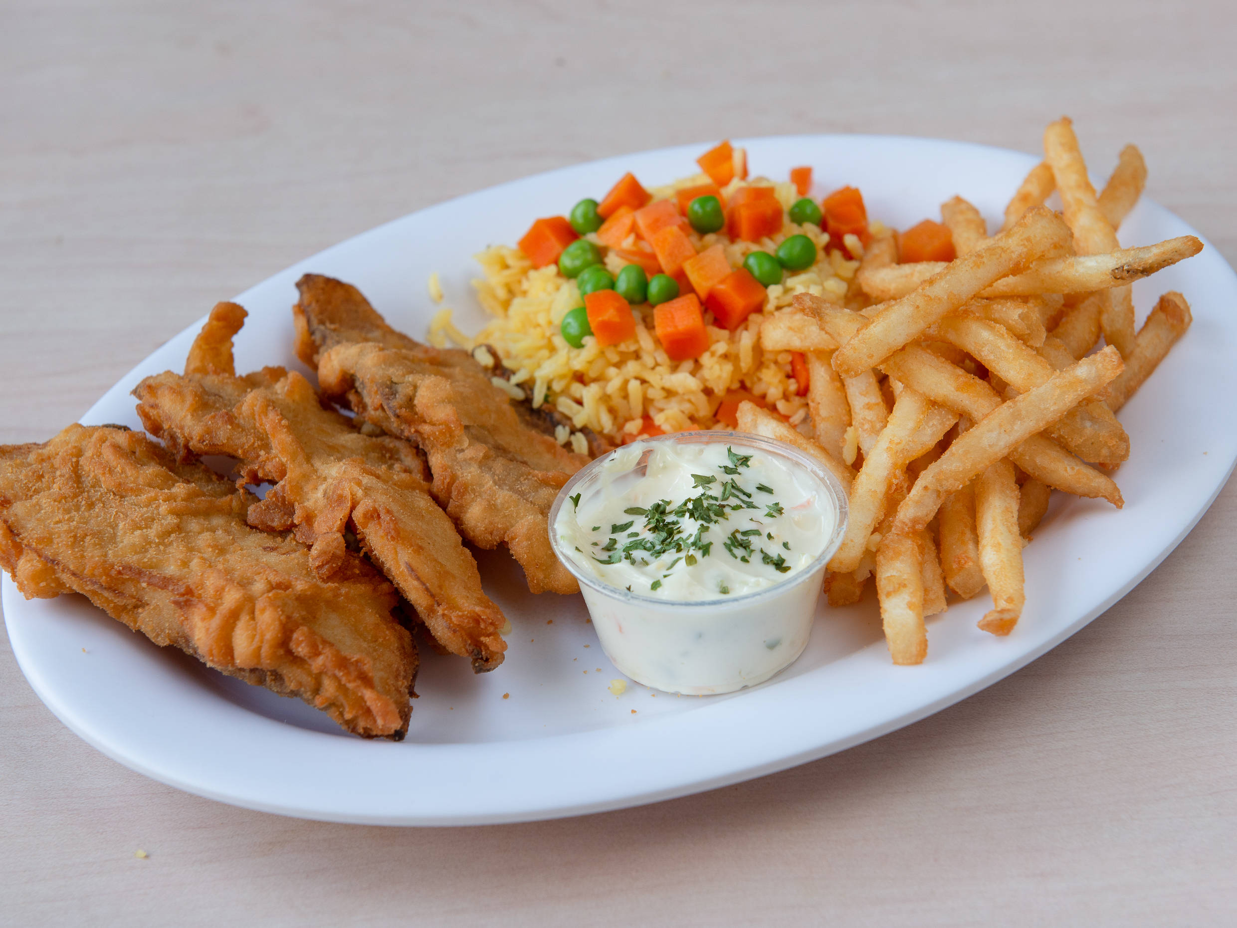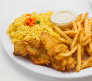 3 filetes de pescado empanizado, acompañado de arroz y papas a la francesa