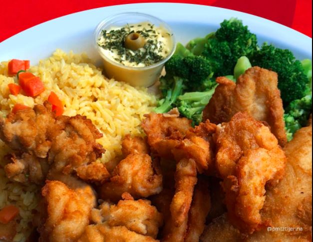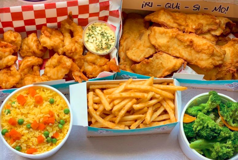 Marti Camarón, 1 caja de filete, 1/2 de arroz, 1/2 de vegetales, papas y aderezo